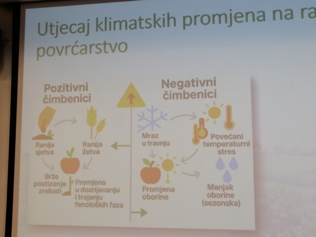 -Podaci prikupljeni u posljednjih trideset godina pokazuju na rast temperature zraka, ali i tla. Bilježimo sve raniji početak vegetacijskog razdoblja, što za posljedicu ima i veću vjerojatnost za pojavu mraza. Podaci pokazuju da smo suočeni i sa sve intenzivnijim i dugotrajnijim sušnim razdobljima, ali i s pojavom oluja s obilnim padalinama u kratkom razdoblju. Projekcije ukazuju na nastavak ovih trendova i u budućnosti, što će otežati poljoprivrednu proizvodnju. Zbog promjene klime neke tradicionalne kulture više neće biti moguće uzgajati pa ćemo ih morati zamijeniti novim kulturama koje će biti otpornije na promjenu klime – istaknuo je na konferenciji Mislav Anić.